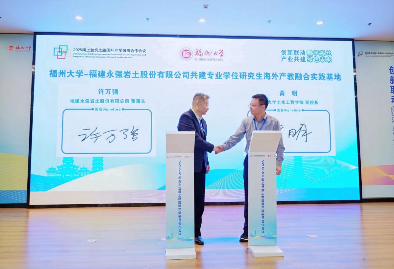 开幕式国际产学研用合作项目签约仪式上,福建永强岩土股份有限公司许万强董事长与黄明副院长共同签署《专业学位研究生海外产教融合实践基地合作框架协议》,标志着双方在人才培养、技术转化、产业服务等领域的协同合作正式启动。