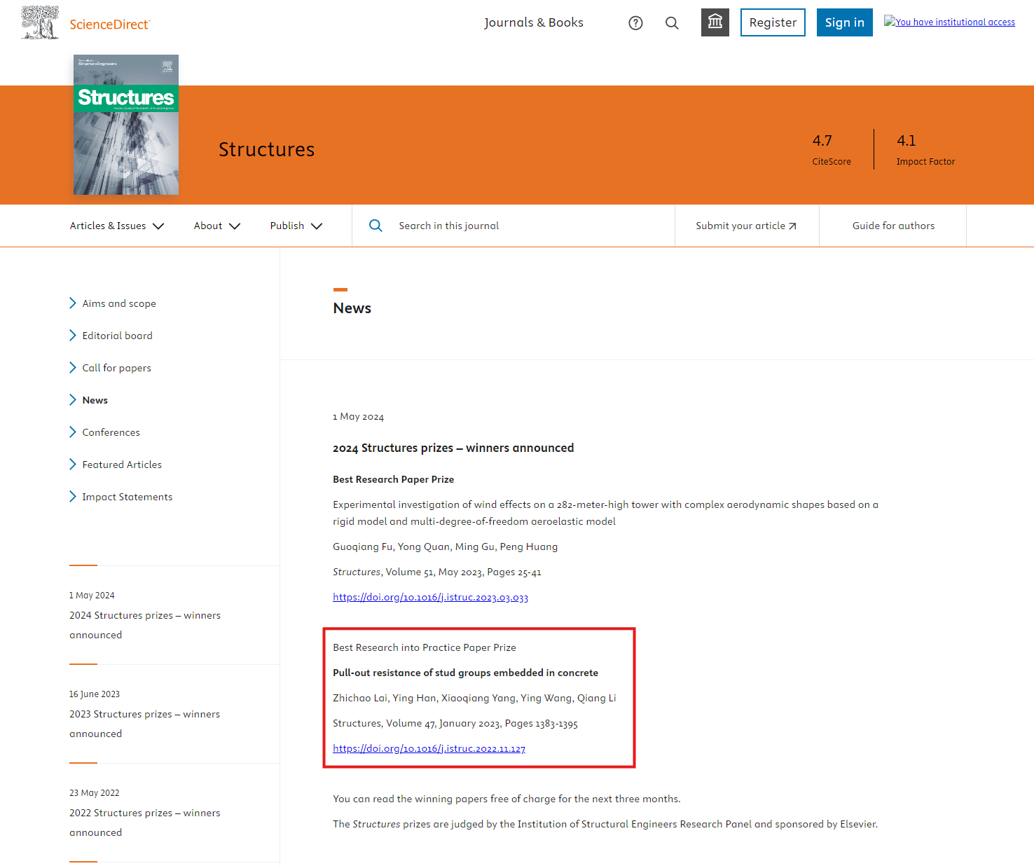据了解,英国结构工程师学会成立于1908年,是全球结构工程领域最具影响力的专业机构之一。该学会设立的“最佳应用研究论文大奖”每年评选一次,每次只颁发给一篇发表在《Structures》期刊上的突出应用基础研究论文,近年获奖者分别来自剑桥大学、隆德大学、帝国理工学院、墨尔本大学、波尔图大学、洛桑联邦理工学院等世界知名院校。
