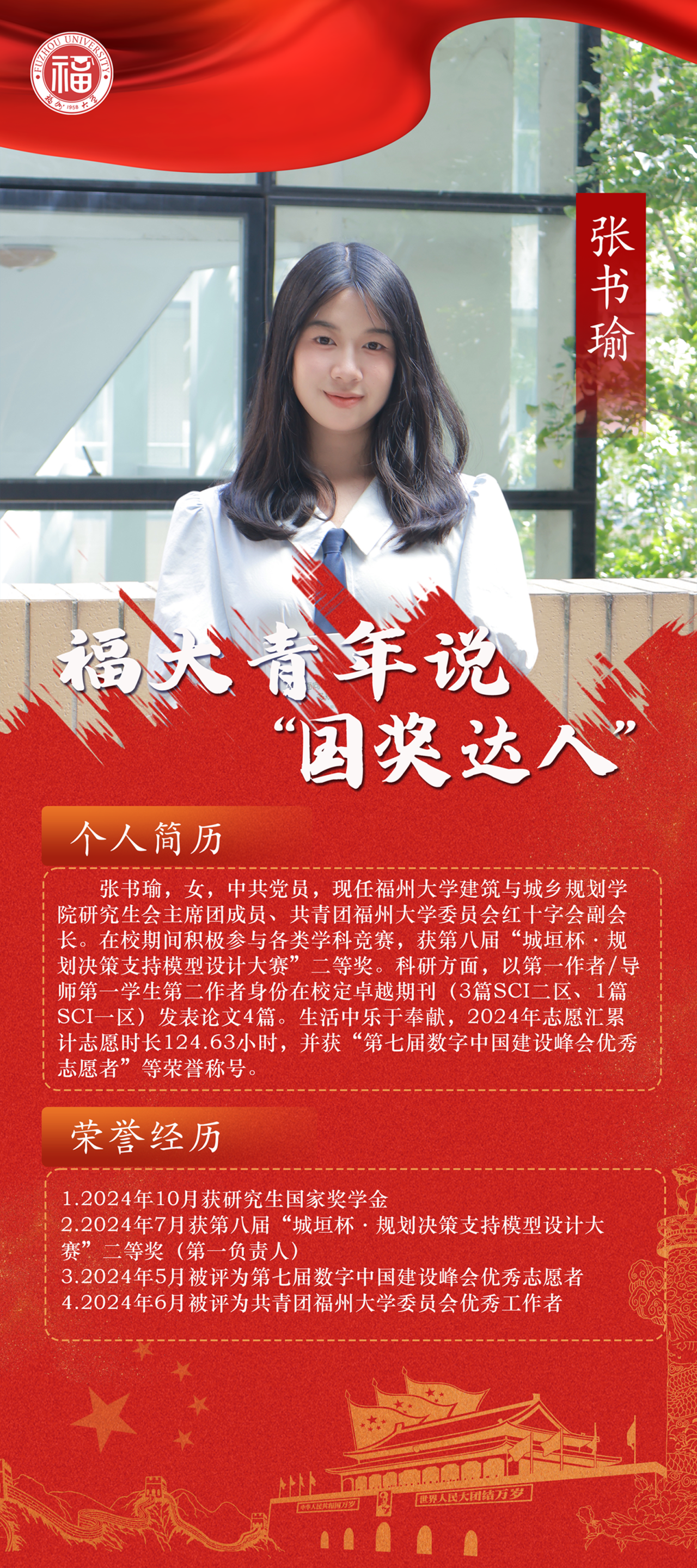 张书瑜,女,中共党员,现任福州大学建筑与城乡规划学院研究生会主席团成员、共青团福州大学委员会红十字会副会长。在校期间积极参与各类学科竞赛,获第八届“城垣杯·规划决策支持模型设计大赛”二等奖。科研方面,以第一作者/导师第一学生第二作者身份在校定卓越期刊(3篇SCI二区、1篇SCI一区)发表论文4篇。生活中乐于奉献,2024年志愿汇累计志愿时长124.63小时,并获“第七届数字中国建设峰会优秀志愿者”等荣誉称号。