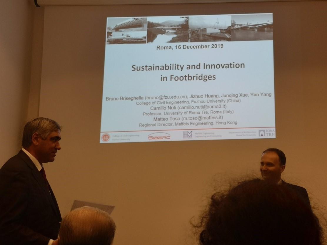 在罗马三大访问期间,罗马三大副校长Camillo Nuti教授(福州大学外聘兼职高端外国专家)为Bruno Briseghella院长一行精心组织了主题为Asian-European Advances in Construction and Design 的 Workshop, 并邀请了包括葡萄牙波尔图大学、意大利卡利亚里大学、罗马一大、罗马二大、罗马三大等多所高校在内的近30位专家学者前来参会,其中有多位外方学者曾来访过中国并与中方人员开展过合作研究。Workshop针对中国土楼建筑文化、建造技艺、受力性能模拟,欧洲生土建筑的加固与修复,意大利建筑抗震评估,以及无缝桥、人行天桥和木拱桥的可持续与创新设计等进行了充分和深入的交流与探讨。此外,Bruno Briseghella院长一行还与中意中心罗马三大负责人Camillo Nuti副校长就2020年成立中意中心意大利办事处的前期筹备工作和具体细节进行了深入交流和探讨;同时对2020年在意大利举办第5届中意学术夏令营活动的可能性及组织形式达成了初步共识。